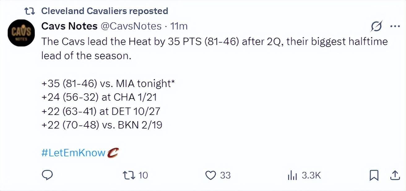 上半場騎士領先熱火35分是本賽季上半場最大分差紀錄。