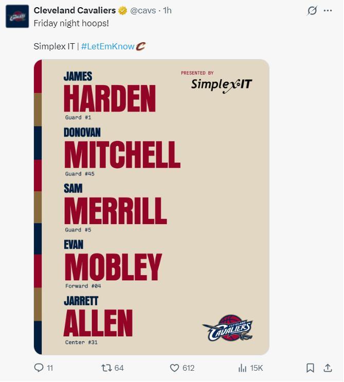騎士:米切爾10中1拿6分6助攻,哈登17分14助攻5籃板,莫布利23分10籃板,阿倫18分10籃板,梅里爾10分4助攻,斯特魯斯29分8籃板8三分,埃利斯10分,託布11分。