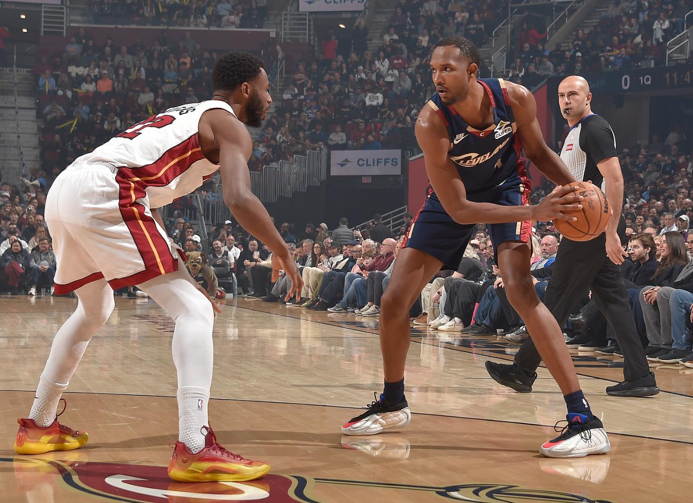 這是兩隊三天裏第二次交手,G1騎士慘敗熱火,這場G2回到克利夫蘭阿倫傷停10場後復出 了,他的復出讓熱火的中鋒阿德巴約優勢全無,2.11米的阿倫站在籃下就是一個巨大的防守壓力,熱巴首節3中0一分沒拿,但阿倫單節拿到8分4籃板,斯特魯斯替補登場三分5中4更是炸裂,在哈登、米切爾手感不佳的情況下騎士40-27領先熱火。