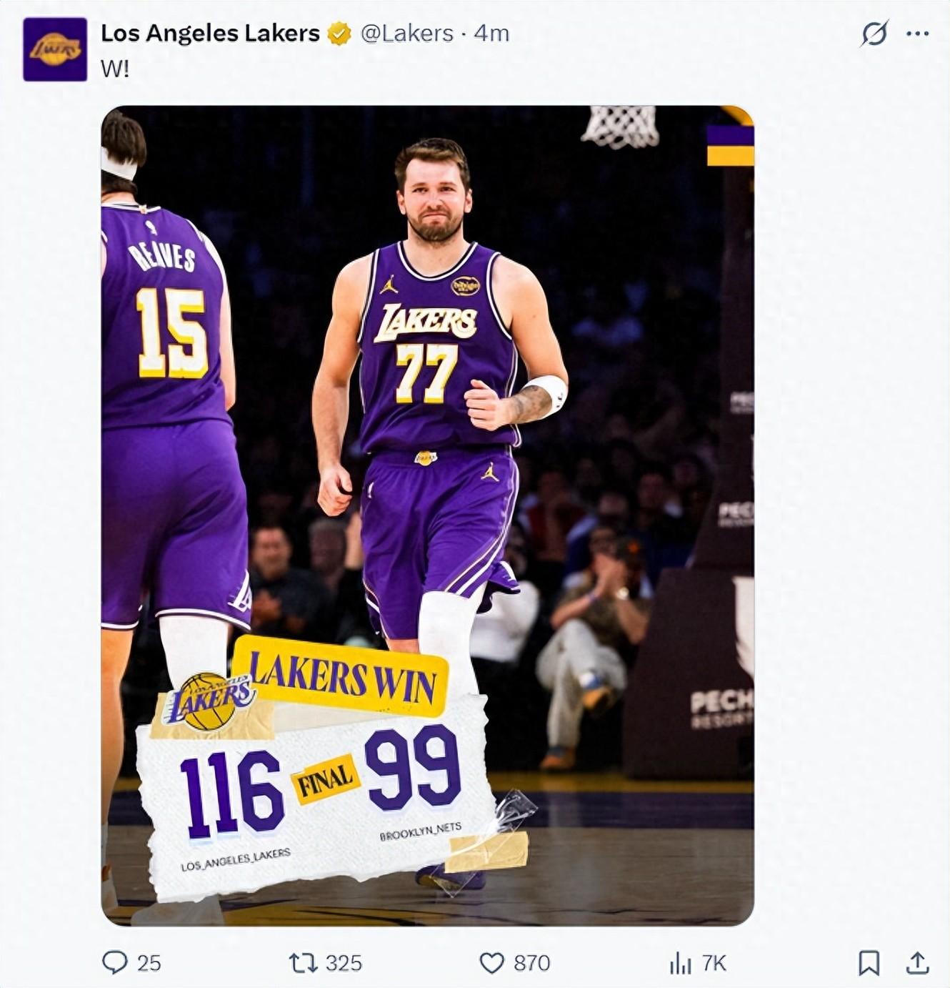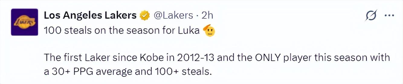 此役東契奇繼續一戰創造多項紀錄:1.湖人生涯第100次搶斷,是科比12-13賽後首位單賽季100搶斷球員;