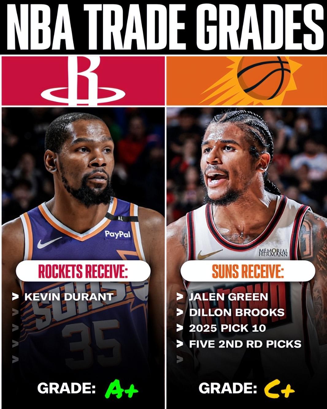 都說火箭隊送出格林、狄龍、26年10號籤、5個次輪籤換到杜蘭特是A+的交易,可本賽季火箭戰績44勝29負(西部第六),而上賽季火箭52勝30負西部第二。上賽季太陽戰績已經41勝33負西部第七而太陽上賽季36勝46負西部第11,從這個方面來看這筆交易的贏家實際上是太陽 。