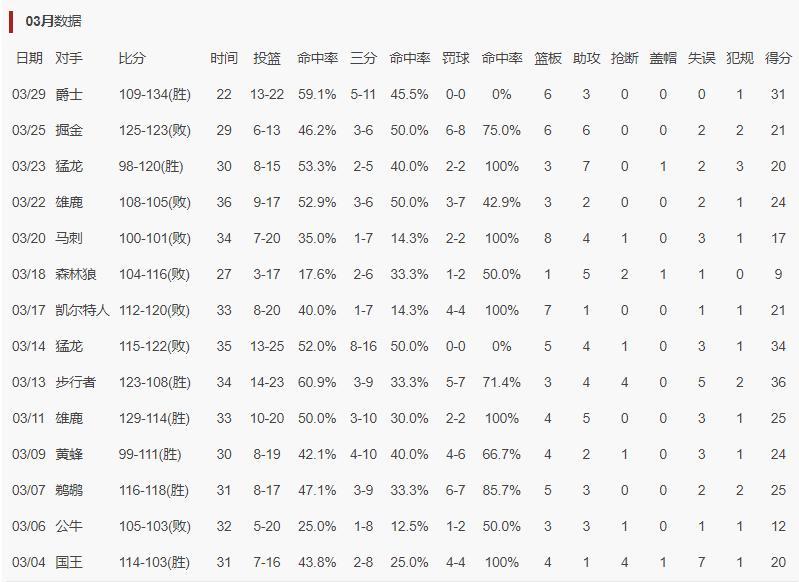 杰倫-格林整個三月份的狀態呈現回暖的趨勢,這個月14場比賽有11場20+與三場30+,這個月杰倫-格林場均31.3分鐘,拿到22.2分4.2籃板3.4助攻1.1搶斷0.2蓋帽,命中率43.8%,三分命中率33.3%。(最近四場比賽都拿到20+且只有一場命中率不足五成)