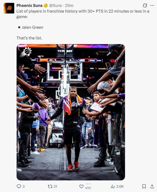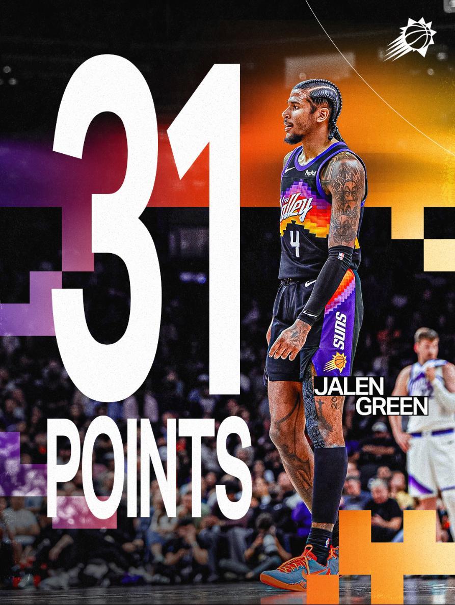 3.格林22分鐘拿到30+,他是太陽1968年建隊後最快30+的球員;
