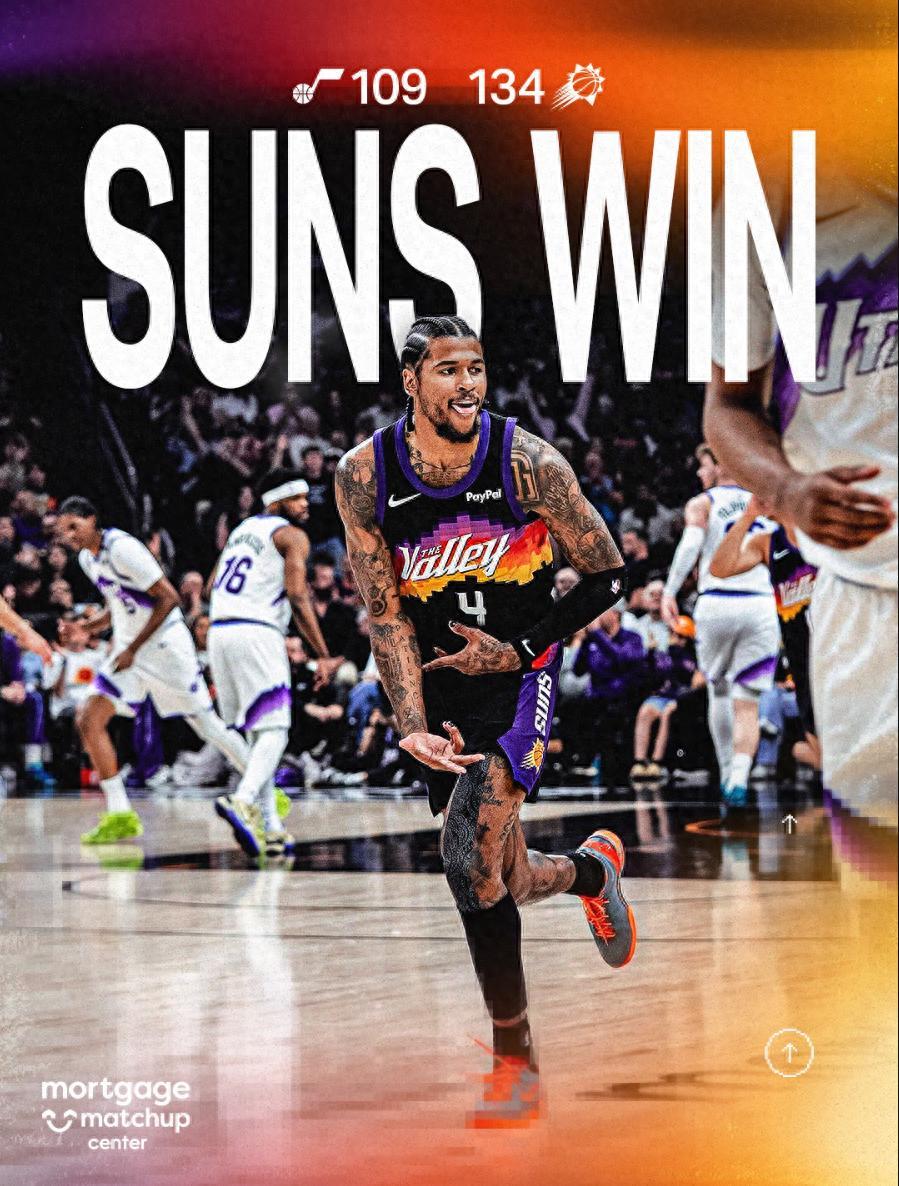 北京時間3月29日,NBA常規賽,菲尼克斯太陽134-109大勝猶他爵士,這場比賽後太陽與快船的勝場差再度拉開到3個。太陽首節就領先18分,半場已經領先到28分,下半場太陽的防守專注度纔有所下滑,布克26分鐘打卡,格林22分鐘打卡,小奧21分鐘打卡,吉萊斯皮27分鐘打卡。