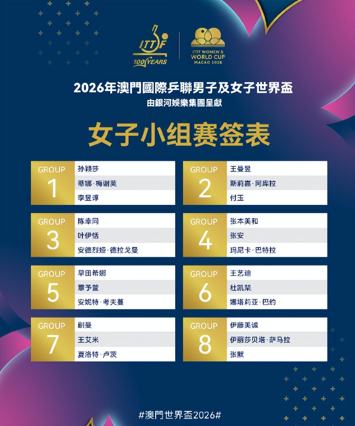 目前男女單的籤表已經出爐,女單世界第一的孫穎莎在G1組:孫穎莎、李昱諄、梅謝芙;第一個比賽日孫穎莎就將出戰李昱諄,澳門世界盃是分小組賽與淘汰賽,小組賽比賽採用5局3勝制,小組第1名晉級第二階段。第二階段淘汰賽共16名選手參加,比賽採用7局4勝制。