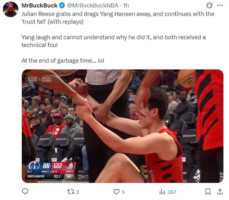 美媒也爲楊瀚森抱不平:在比賽垃圾時間,朱利安-里斯從身後抓住楊瀚森將他拖走,然後進行了‘信任墜落’(抱摔),楊瀚森哈哈大笑不明白里斯爲何這樣做,裁判在看了回放的情況下給了兩人技術犯規。