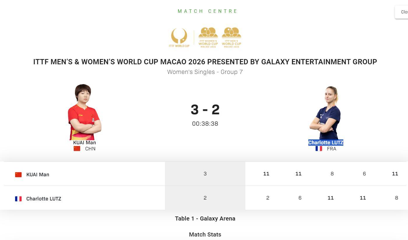 蒯曼是2025年世界盃的女單亞軍,她去年的勢頭非常猛烈,可進入2026賽季後偃旗息鼓世界排名一路走低,此役她面對的是世界排名53位,年僅20歲的法國小將盧茨,結果在大比分2-0領先的情況下連輸兩局,決勝局開場更是1-5落後陷入絕境。