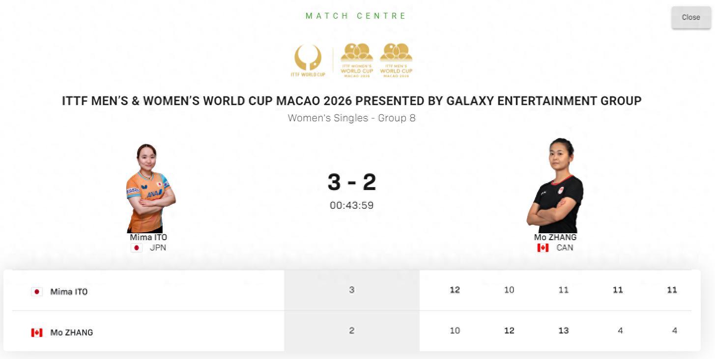 北京時間3月30日,2026年澳門世界盃小組賽,日乒選手伊藤美誠3-2險勝加拿大老將張默,五局比分:12-10、10-12、13-11、11-4、11-4。這場比賽伊藤美誠在大比分1-0領先的情況下連輸兩局,在37歲張默體能下滑後伊藤美誠才連扳兩局拿下勝利。