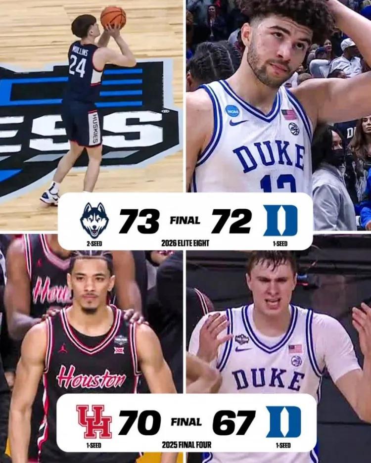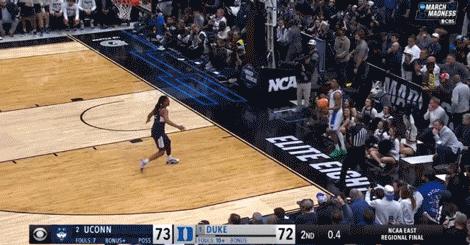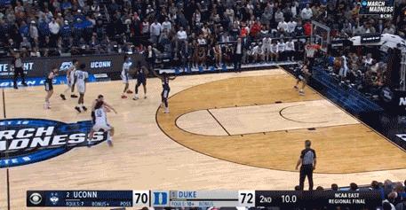 NCAA男籃錦標賽八強賽中,頭號種子杜克大學在大幅領先19分的優勢下,最後10秒因致命失誤遭康涅狄格大學搶斷,被對手投中超遠三分絕殺,以72-73慘遭逆轉。