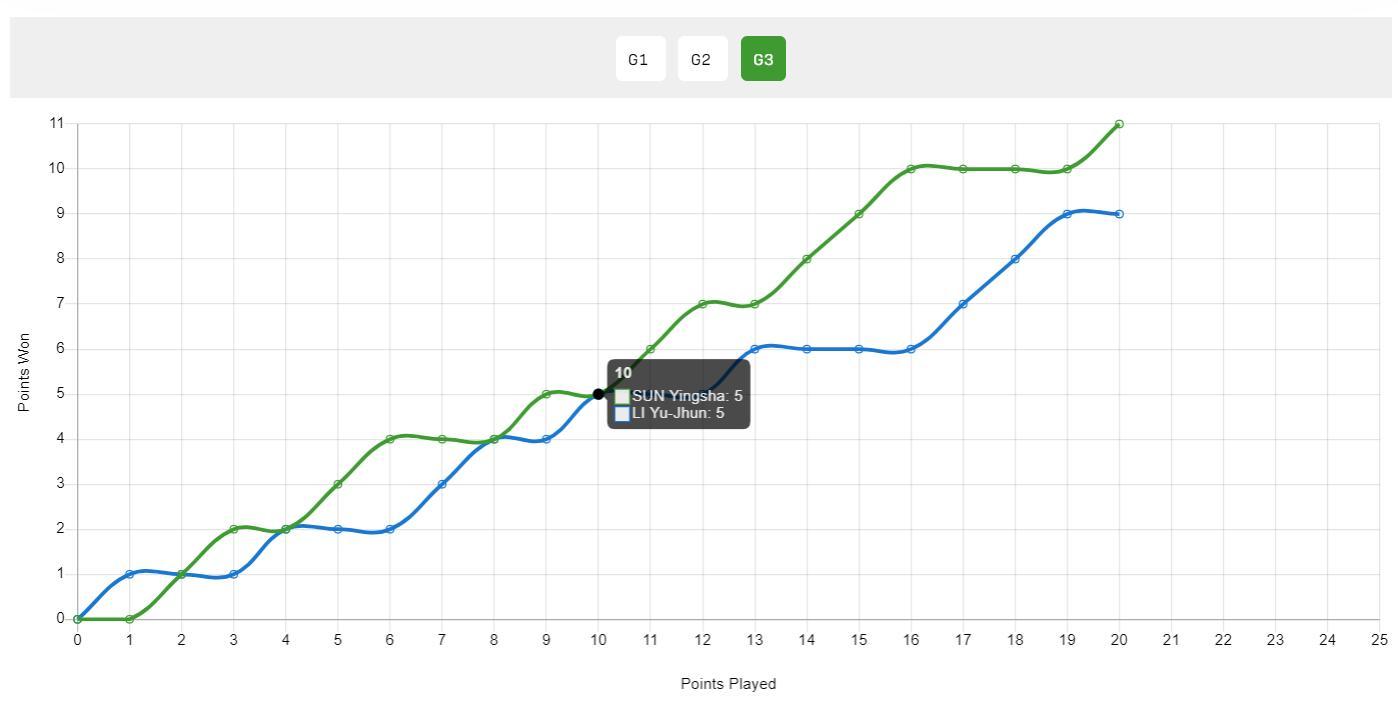 第三局開場兩人1-1、2-2,隨後孫穎莎4-2領先,隨後兩人5-5平,孫穎莎7-5反超後,李昱諄追到6-7,孫穎莎突然發力直接10-6拿到賽點,李昱諄追到9-10後,孫穎莎拿到關鍵分11-9拿下勝利。