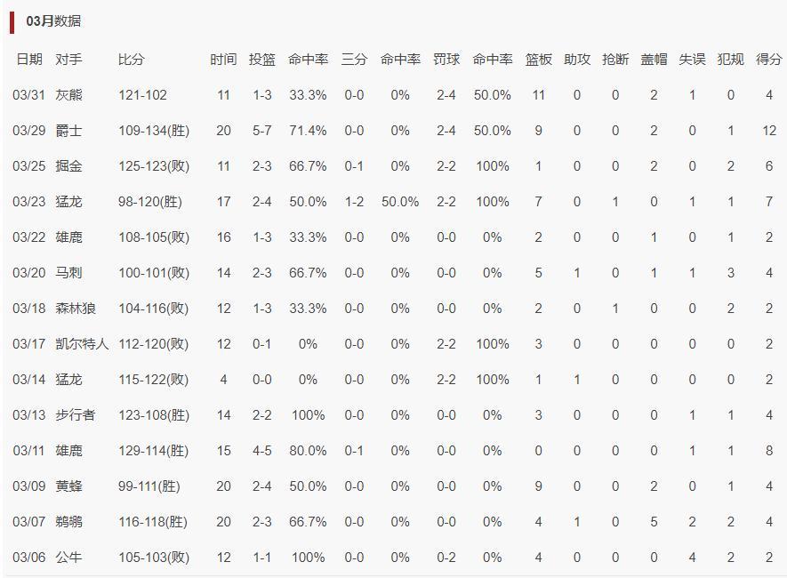 兩天之前太陽對陣爵士隊一戰,他20分鐘,7中5,拿到12分9籃板2蓋帽,命中率71.4%,他拿到12分也是生涯新高,換言之他連續兩場比賽創造新高。
