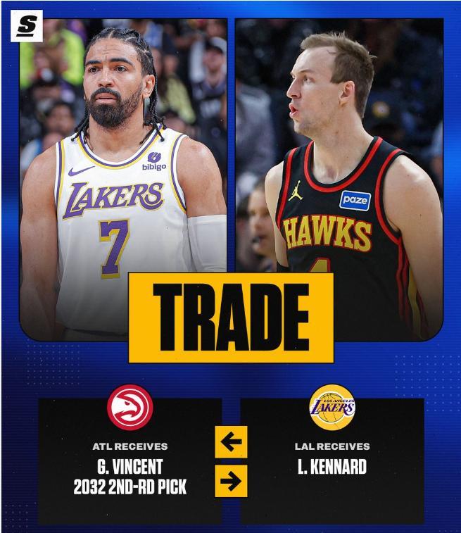 湖人與老鷹的交易細節,湖人用2032年次輪籤+文森特換走肯納德,肯納德加盟湖人後場均21.8分鐘,拿到8.3分2.3籃板1.7助攻0.5搶斷,命中率54.8%,三分命中率45.9%,場均命中1.4個三分球。