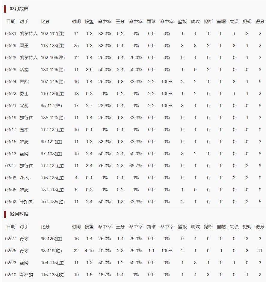 這位29歲處於巔峯期的後衛真的算是沉淪到底,他本賽季在湖人場均19.3分鐘,拿到4.8分0.9籃板1.3助攻0.5搶斷,命中率34.6%,三分命中率36.9%,他在湖人至少還能命中三分球。