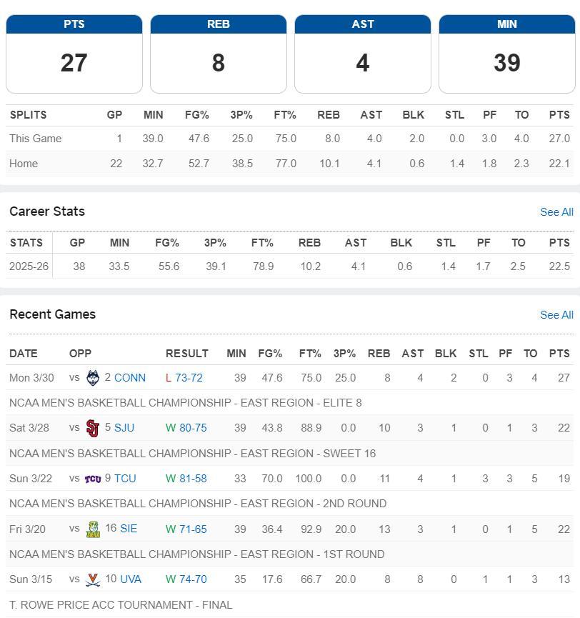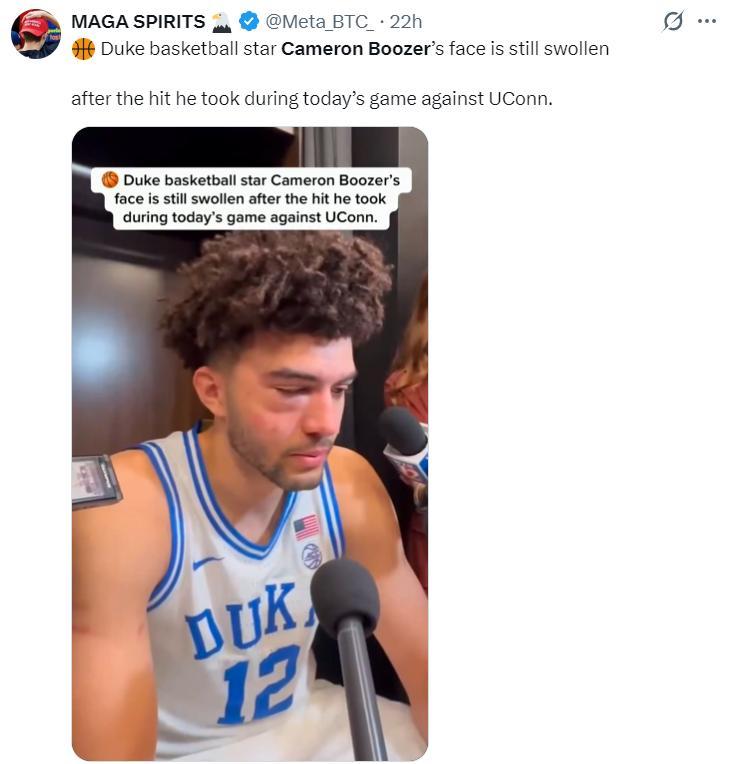 在NCCA瘋狂三月精英八強賽中,卡梅隆-布澤爾全場比賽39分鐘,21中10,三分4中1,拿到27分8籃板4助攻4失誤2蓋帽,命中率47.6%。但杜克大學在終場前6.5秒領先2分還手握球權的情況下,卡梅隆的弟弟凱登傳球失誤,最終康大的馬林斯超遠三分絕殺。