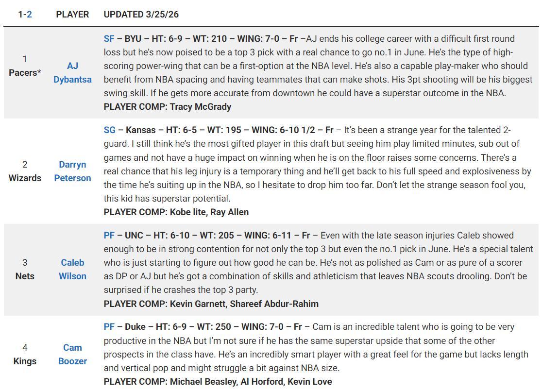 而在DX的預測上,布澤爾的預測順位是第四,最終是由國王選中他。狀元的人選都是楊百翰大學的迪班薩,看起來四號位的布澤爾被看衰前景。