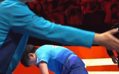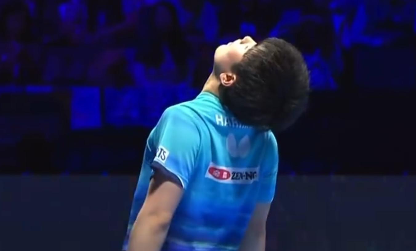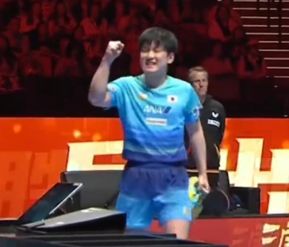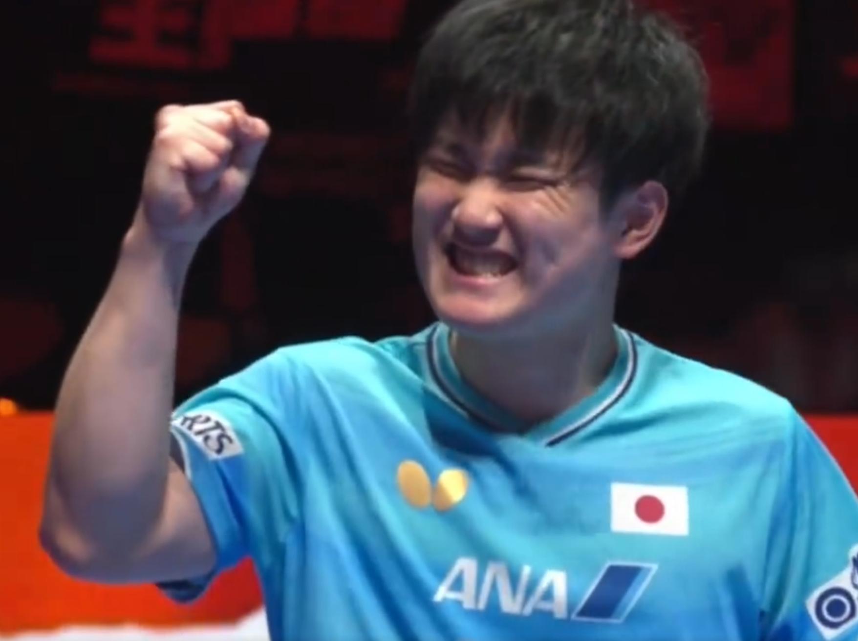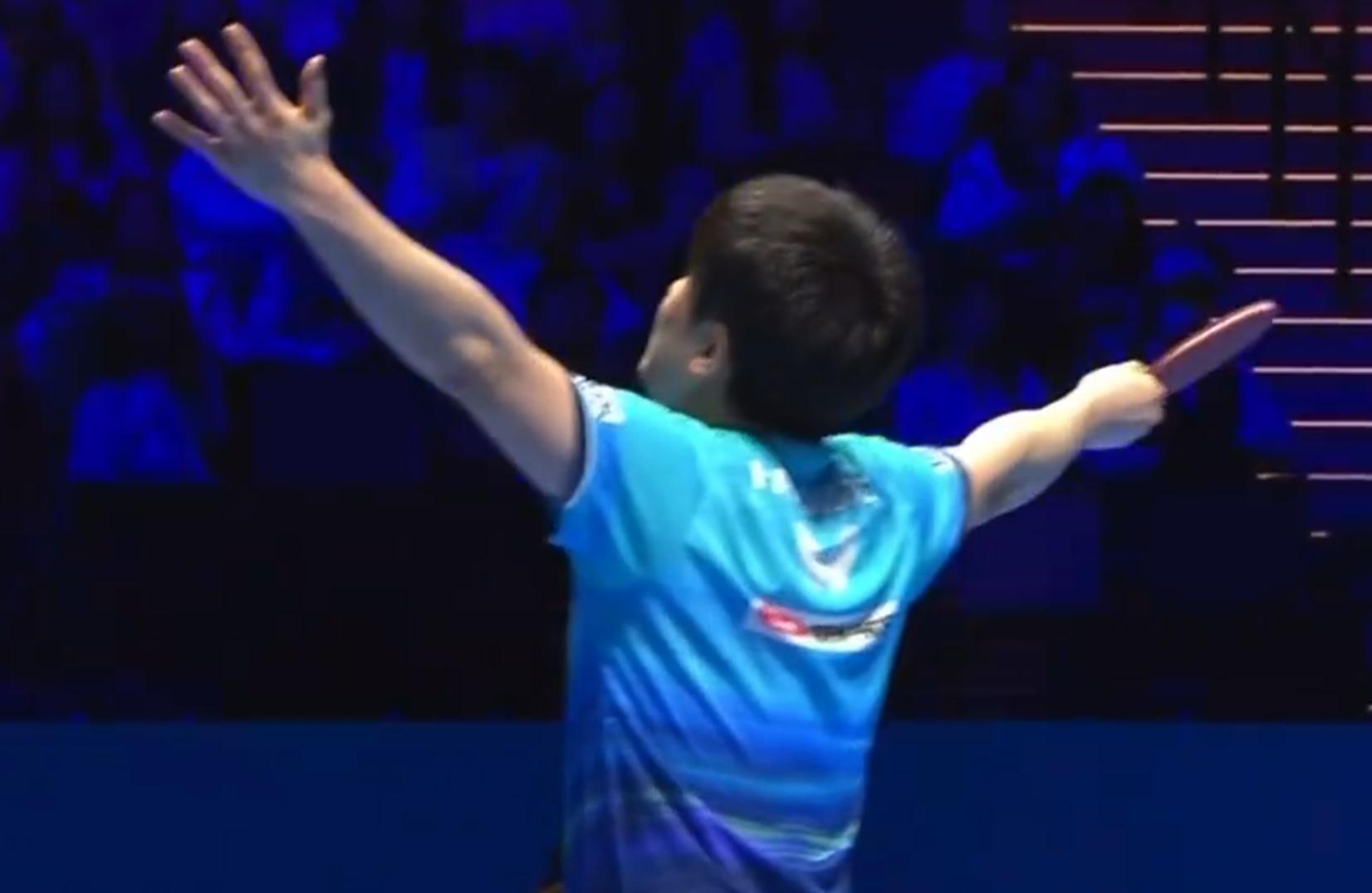 跪地起身後張本智和跟裁判握手後他握拳,22歲的日乒一哥興奮到臉都皺皮了,張本智和在去年的澳門世界盃止步八強,前年的澳門世界盃是銅牌,他很希望能更進一步。