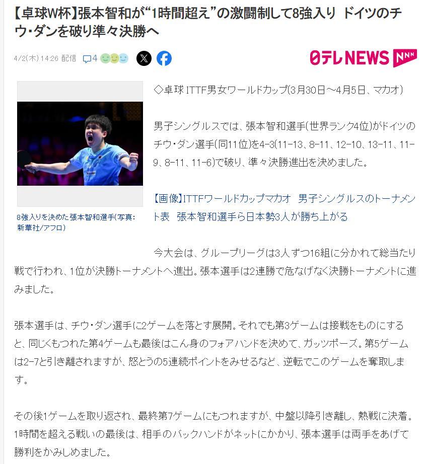 賽後日本媒體的報道,張本智和與邱黨的七局大戰超過1個小時,此役張本智和在0-2落後的情況下逆轉晉級 八強。