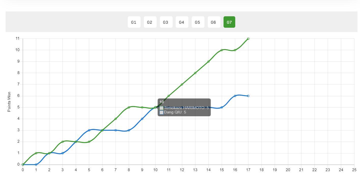 張本智和在大比分0-2落後的情況下被邱黨連扳兩局,天王山之戰邱黨一度7-2領先,張本智和打出5-0的攻勢扳成7-7,隨後8-8、9-9,關鍵分上是張本智和拿下,張本智和3-2反超邱黨。