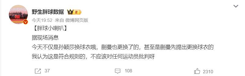 有更多的大V站出來澄清:蒯曼是先提出更換球衣,孫穎莎纔去換了球衣,這是符合規則的,不應該對任何運動員有批判。