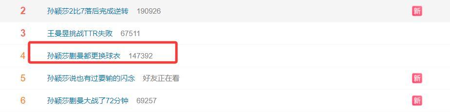 賽後孫穎莎/蒯曼這場大戰多個詞條都登上熱搜,孫穎莎/蒯曼都更換球衣目前排在熱搜第四的位置。相信大家從這裏應該明白了,不只是孫穎莎一個人換了球衣,實際上蒯曼也換了。