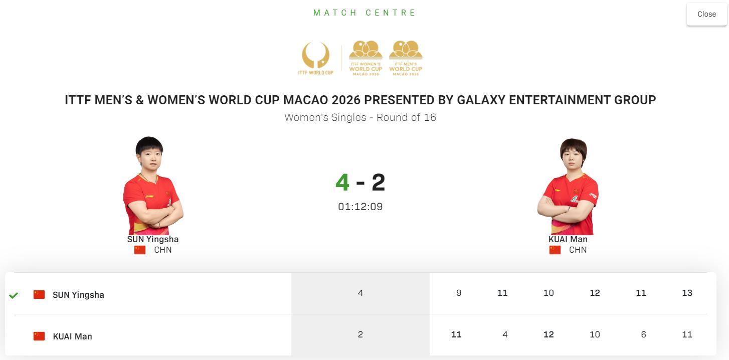 鏖戰73分鐘的六局大戰才迎來了最終章,孫穎莎4-2蒯曼晉級八強,六局比分:【9-11,11-4,10-12,12-10,11-6,13-11】,時隔19天覆仇蒯曼。