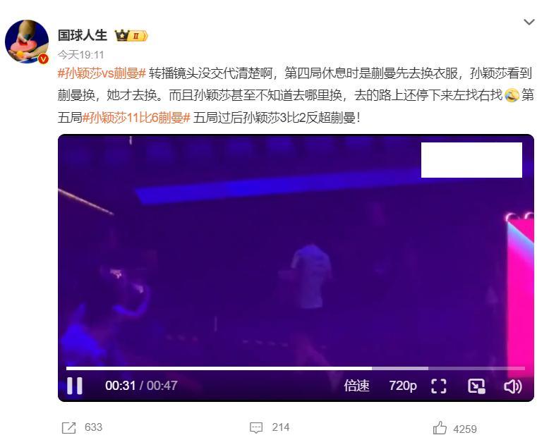 博主還表示,轉播鏡頭沒交代清楚,第四局休息時蒯曼先去換衣服,孫穎莎看到蒯曼去換她纔去的。而且孫穎莎甚至不知道在哪裏換,去的路上來回找。