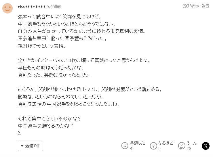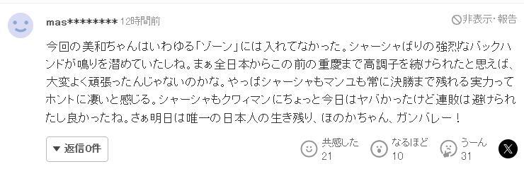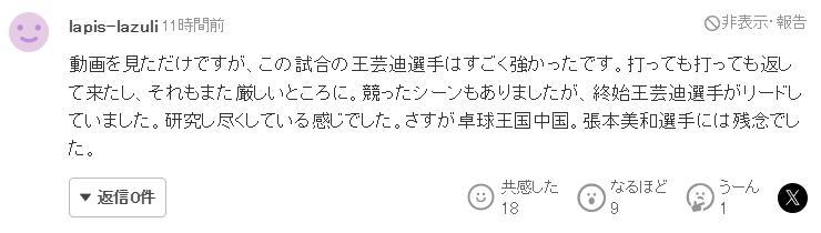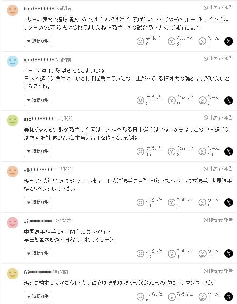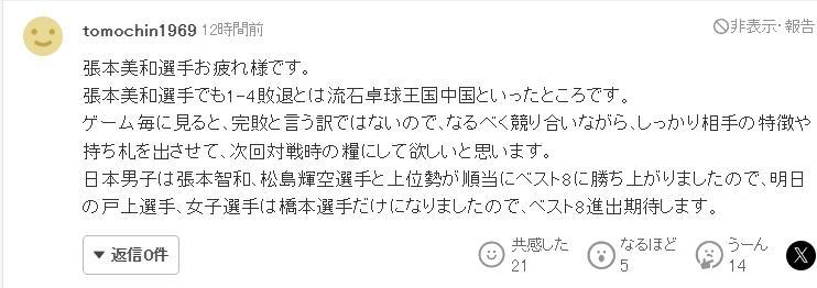 日本球迷熱議張本美和無緣世界盃八強:1.美和這次沒有進入所謂的‘Zone’,她的反手擊球沒有力量,想想從全日本錦標賽到重慶冠軍賽,她是不是真的保持專注了?