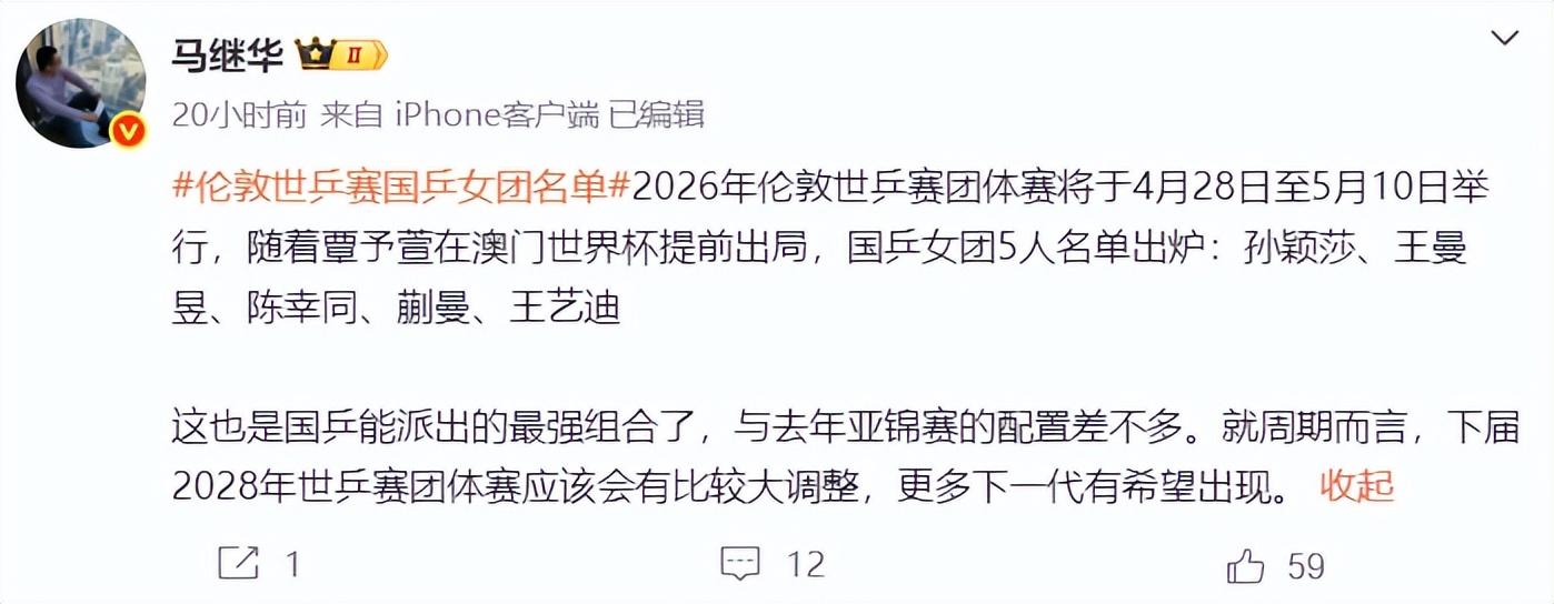馬繼華:這也是國乒能派出的最強組合,與去年亞錦賽的配置差不多,就週期而言,2028年世乒賽團體賽可能會有較大的調整。