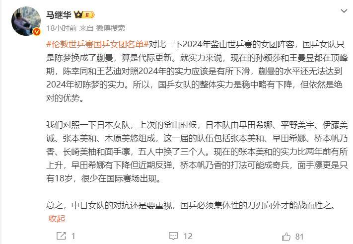 但對比日本隊,當時日本隊是早田希娜、平野美宇、伊藤沒有、張本美和、木原美悠,這一屆是張本美和、早田希娜、橋本帆乃香、長崎美柚、面手凜五人換了三人,張本實力比兩年前提升,早田有所下滑,橋本可能是奇兵,面手凜只有18歲國際賽場很少出現。國乒還是需要重視日本隊。