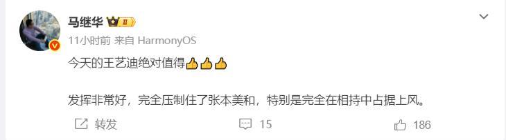 名嘴馬繼華也盛讚王藝迪完全壓制張本美和,進入相持就可以佔據上風。