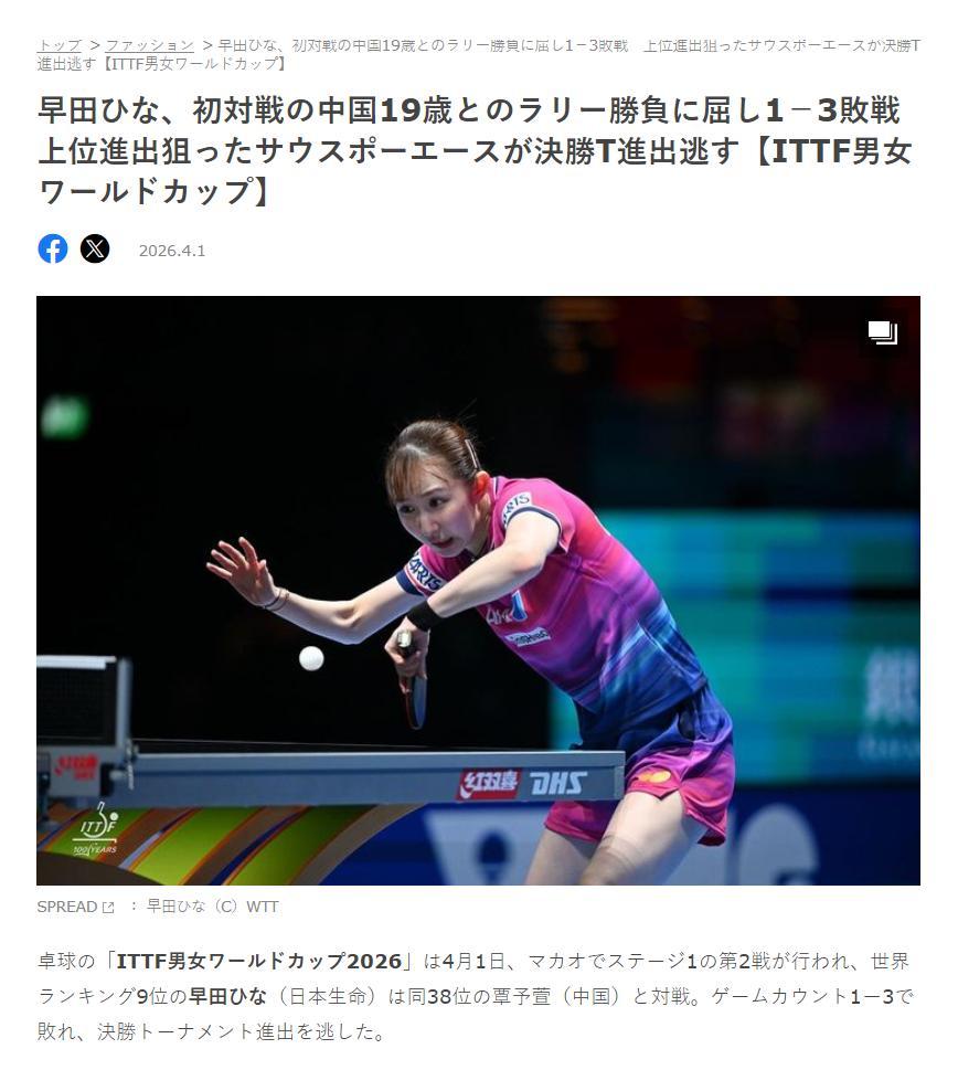 日媒《SPREAD》再度發文:早田希娜在與中國19歲新星覃予萱的首次交手中屈辱失利,未能進入16強,原本有希望衝擊四強席位的左撇子王牌遺憾止步小組賽。