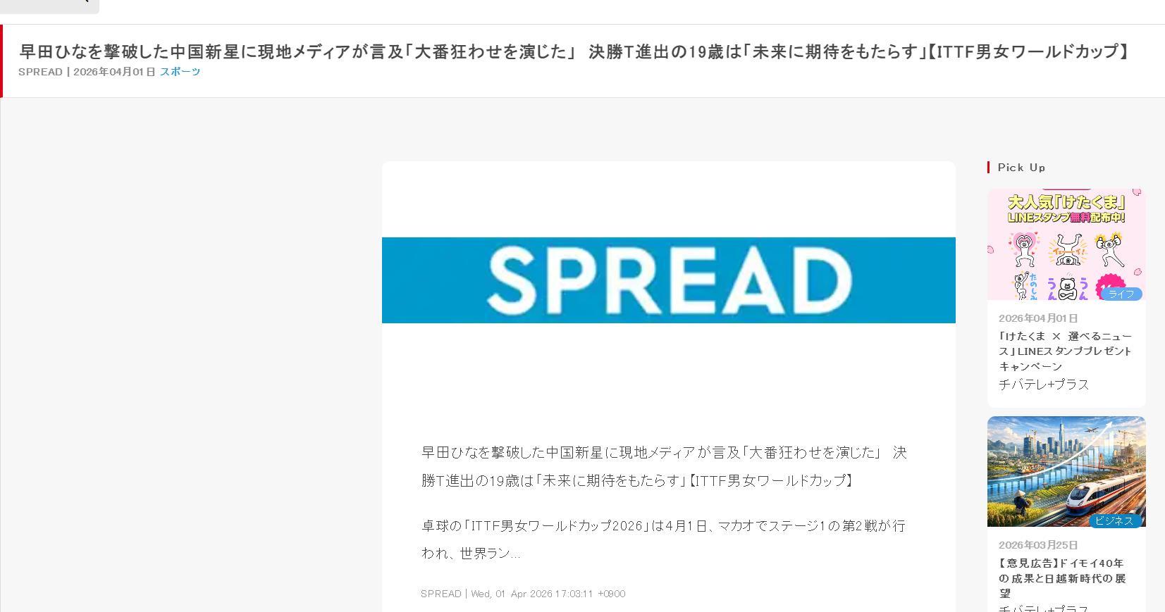 多家日本媒體都沮喪發聲,日媒《SPREAD》寫道:擊敗早田希娜的中國新星被盛讚‘上演驚天逆轉’,這位進入16強的19歲小將爲中國女乒的未來帶去希望。