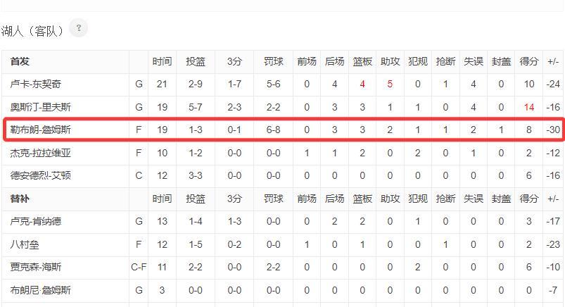 詹姆斯第三節4中2拿到5分3籃板,末節因爲分差太大他直接作壁上觀了,全場比賽26分鐘,7中3+三分4中1,罰球8中6,拿到13分6籃板2助攻1搶斷1蓋帽,命中率42.9%,三分命中率25%,真實命中率61.8%,正負值-37。