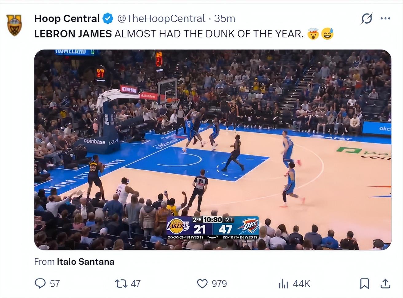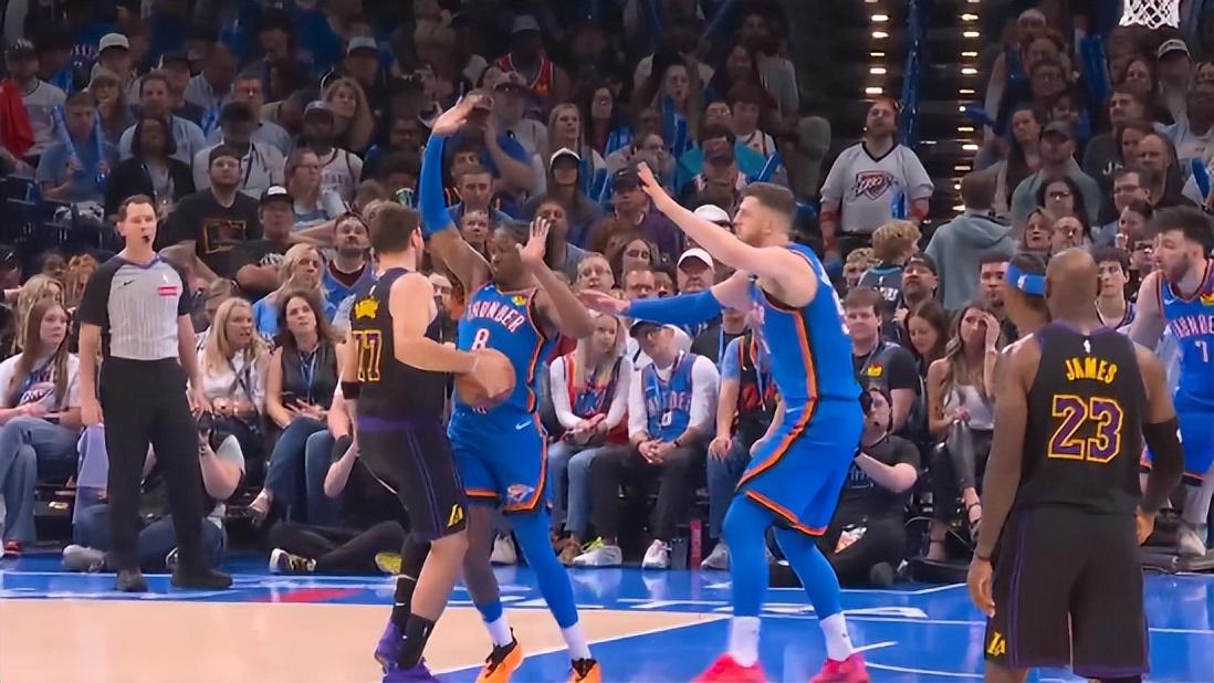 開場湖人就被雷霆打垮了,裏夫斯個人4次失誤讓湖人開場崩盤,詹姆斯開場防守端已經非常積極只可惜全隊拉胯,第二節詹姆斯險些完成隔扣2+1,只可惜被犯規沒能扣進。