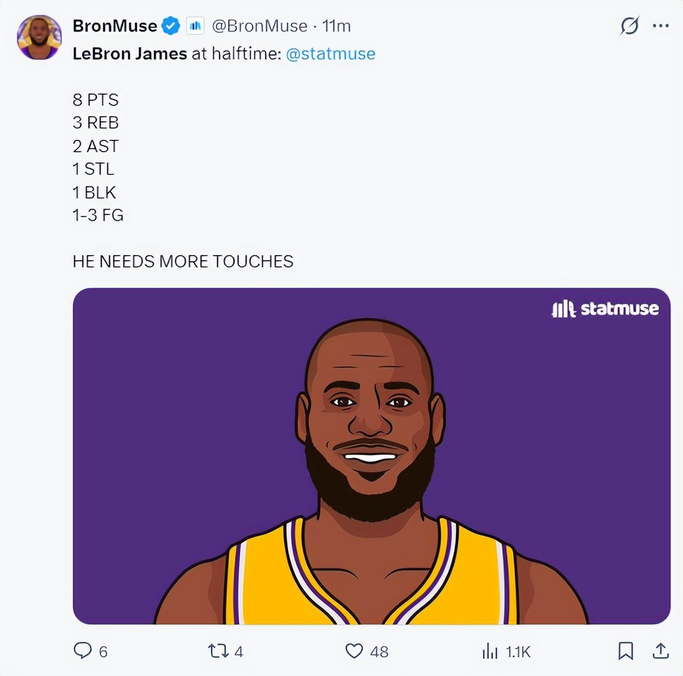 但上半場打完詹姆斯在場-30湖人最差,東契奇在場-24,八村壘在場-23,這讓黑子們各種炮轟老頭子。在半場結束時詹姆斯進入球員更衣室也是低着頭,他非常沮喪。半場讓雷霆拿82分實在是太慘。