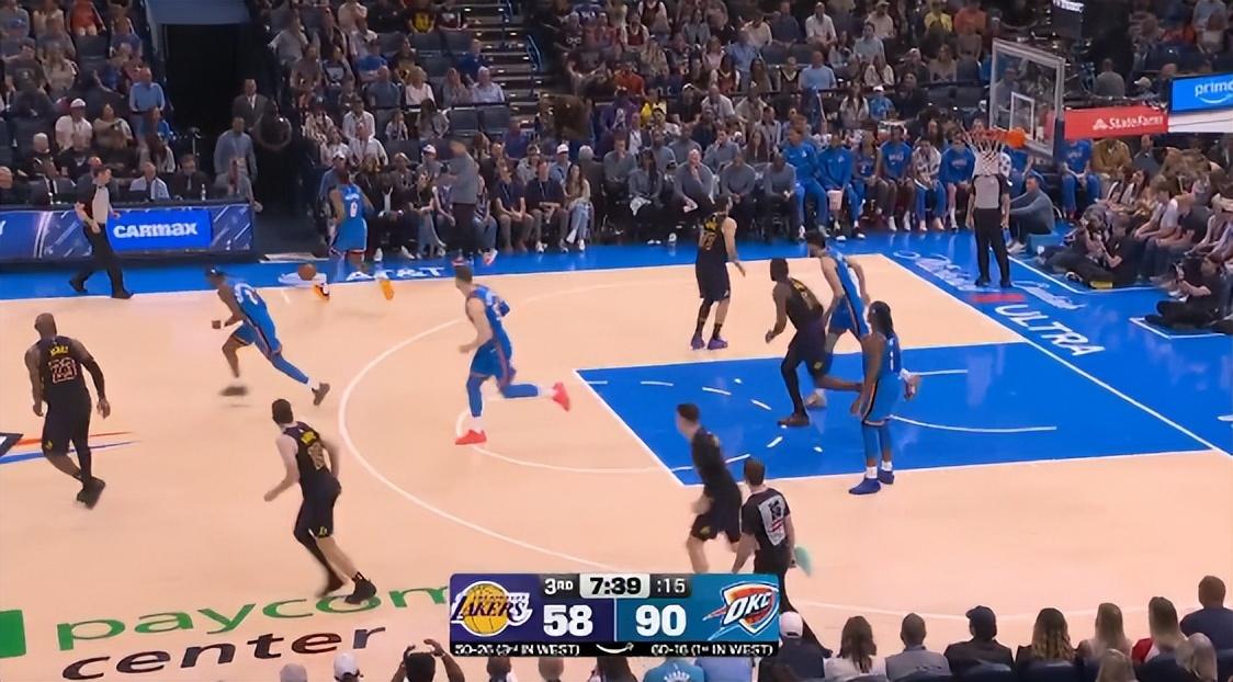 這一球發生在第三節還剩7分39秒,東契奇在傑威的防守下急停,隨後他的左側大腿有一個小的震盪,就是這個震盪導致東契奇左側大腿不適,東契奇立馬捂着左大腿開始單跳,左腳無法用力。