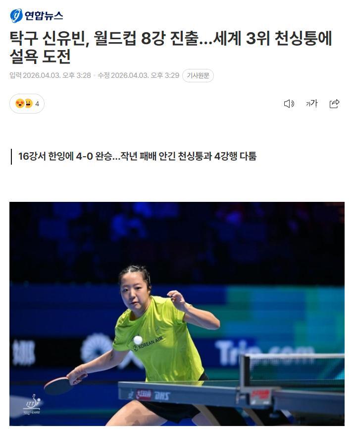 賽後韓國媒體《韓聯社》寫道:申裕斌進入世界盃 八強,她將向世界第三的陳幸同再度發起挑戰。
