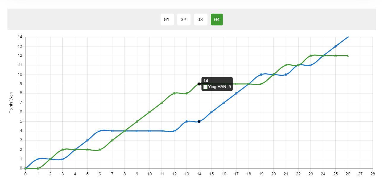 這場比賽申裕斌前三局都贏得非常輕鬆,但在第四局有些波瀾,韓瑩一度9-4領先,但申裕斌並沒有慌亂她連拿5分追到9-9,隨後10-10、11-11、12-12,最終申裕斌拿到關鍵分14-12完成橫掃。