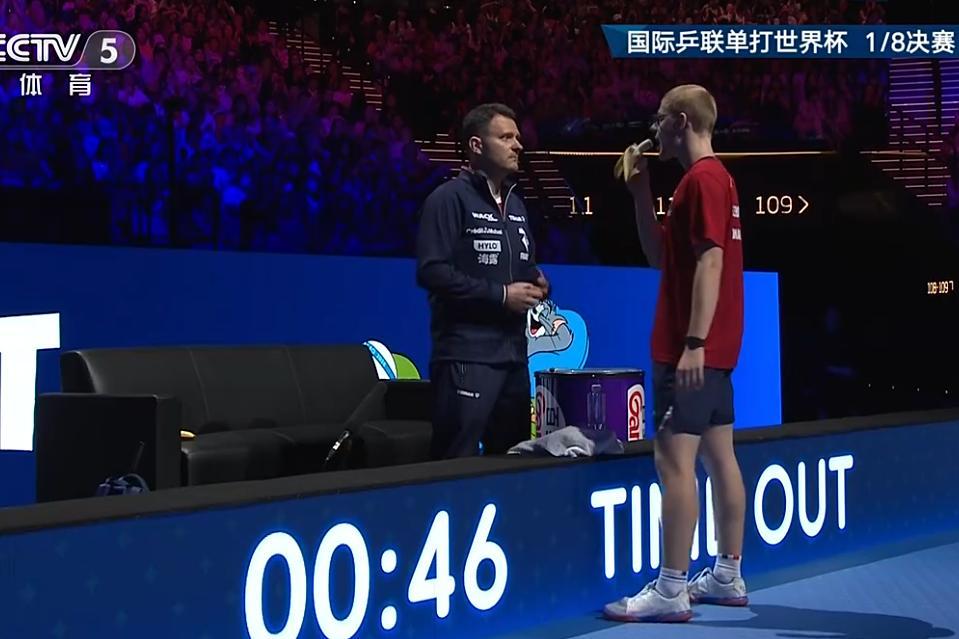 第二局開場小勒2-0領先,王楚欽1-3繼續落後,王楚欽1-4,王楚欽回球連續失誤2-6,小勒趁勢7-2繼續領先,王楚欽追到4-7,王楚欽一個反手5-7法國隊暫停,小勒在場邊喫香蕉。王楚欽追到9-9,王楚欽11-9逆轉。
