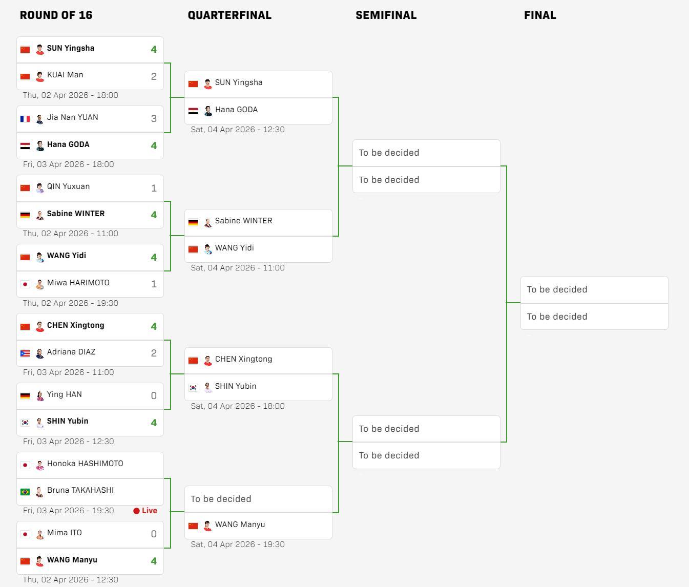 孫穎莎VS漢娜-高達、王藝迪VS沙賓-溫特、陳幸同VS申裕斌、王曼昱VS橋本帆乃香。