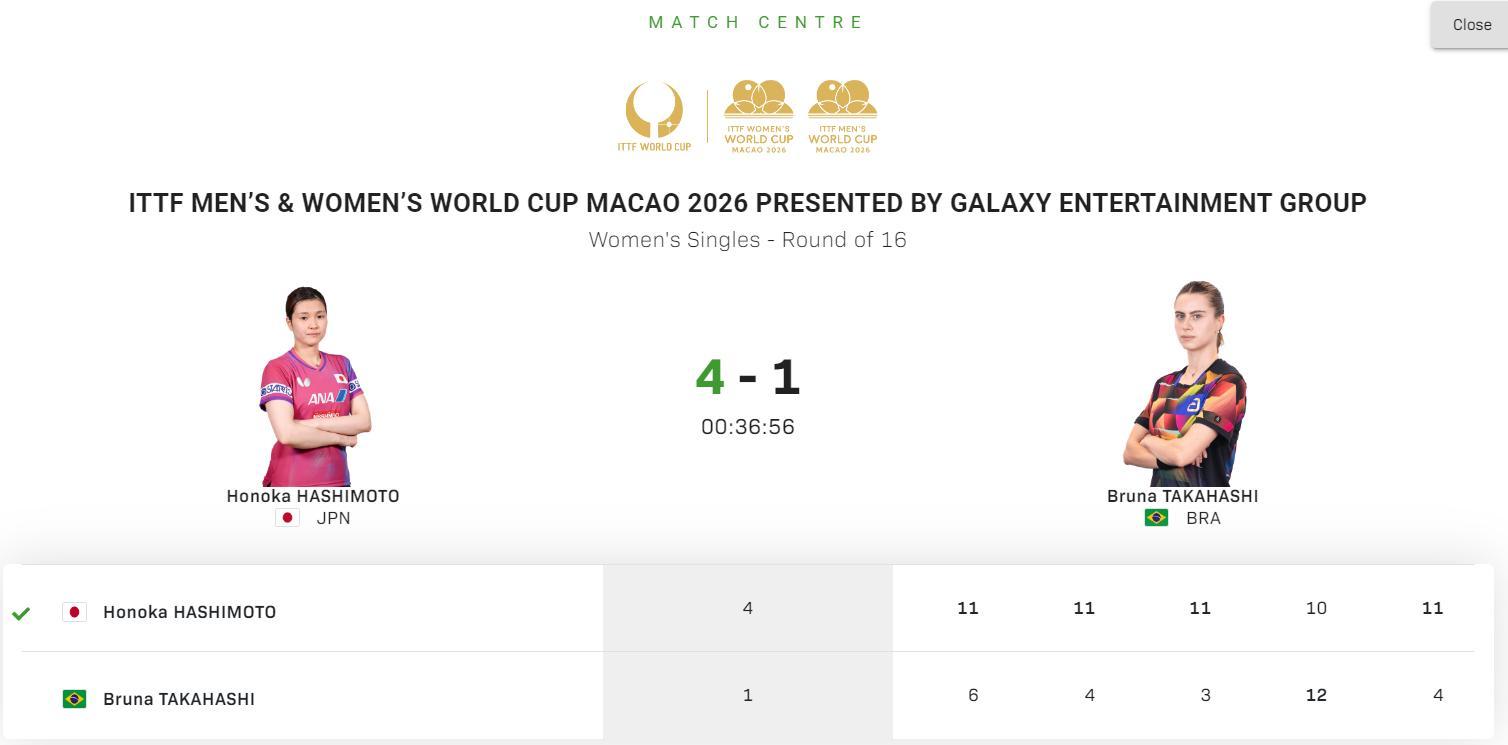 北京時間4月3日,澳門世界盃女單1/8決賽的最終戰打響,橋本帆乃香4-1擊敗高橋-布魯娜,五局比分:11-6、11-4、11-3、10-12、11-4。橋本帆乃香作爲一名27歲的中生代選手是日乒世界盃的獨苗,她也很爭氣的晉級八強。