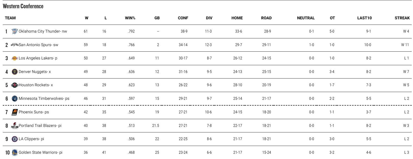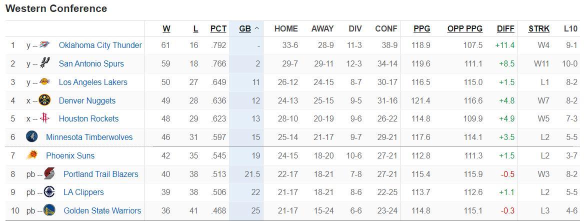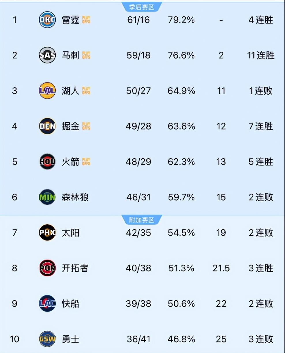 湖人50勝27負只領先掘金1個勝場,領先火箭也只有2個勝場,加上湖人的東契奇常規賽報銷了他們常規賽的戰績下滑也很有可能,掘金、火箭是有可能反超湖人的,那麼就是掘金第三、火箭第四、湖人第五。