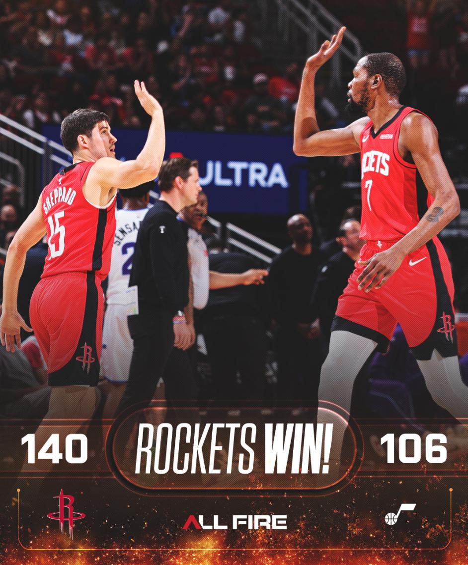 火箭隊140-106大勝爵士後已經豪取五連勝,這場比賽火箭多位核心都是三節打卡,全隊是6人上雙,杜蘭特在場下瘋狂爲球隊第二陣容揮毛巾,火箭隊拿到一波五連勝後已經跟西部第六的森林狼拉開2個勝場。
