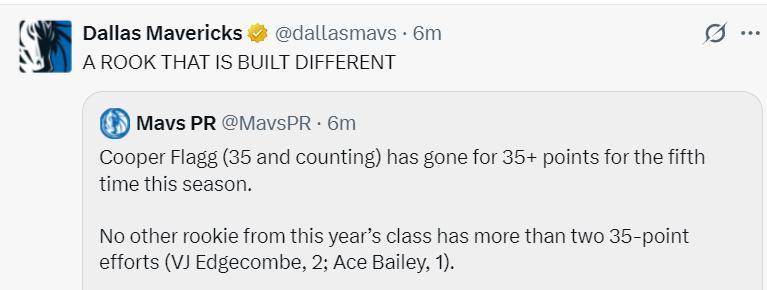 6.弗拉格得分、籃板、助攻、搶斷四項數據都是獨行俠第一,他成爲1984年喬丹後第二位新秀賽季4數據領跑球隊的球員;