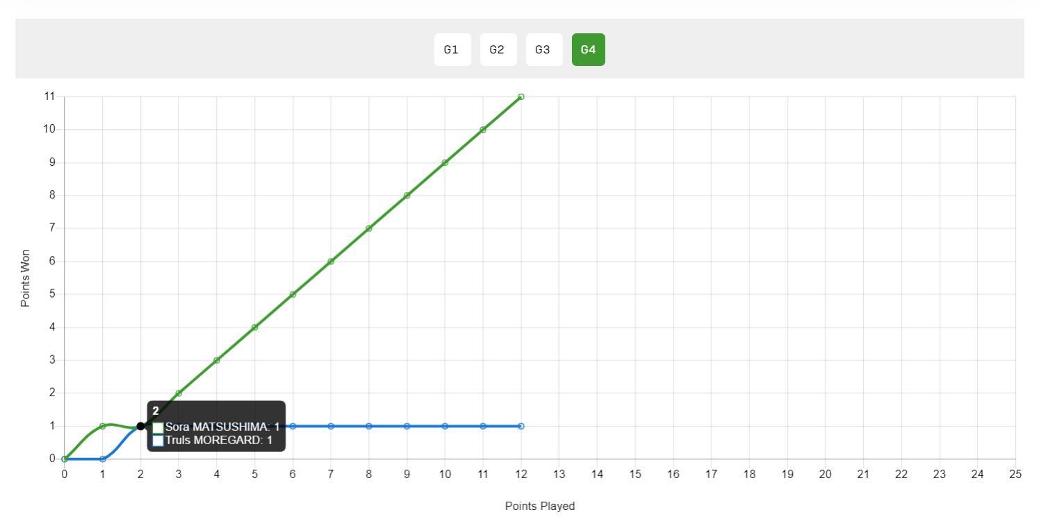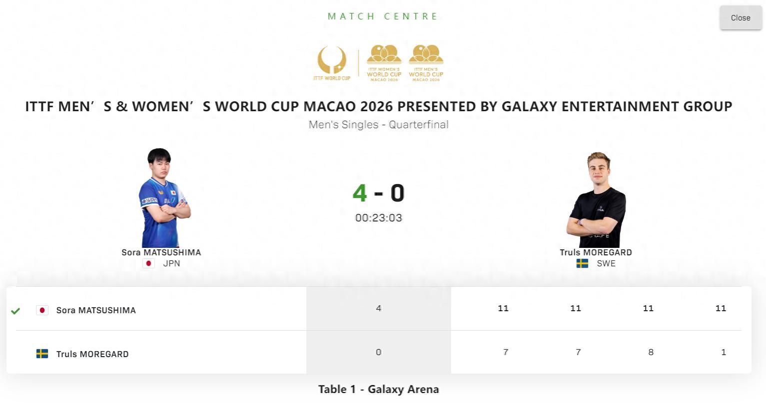 第四局兩人開場1-1還好好的,但莫雷加德直接崩盤了,莫雷加德喫了一波10-0,所有人都不知道發生了什麼事,就看到莫雷加德各種低級的失誤,松島輝空贏得太輕鬆了。