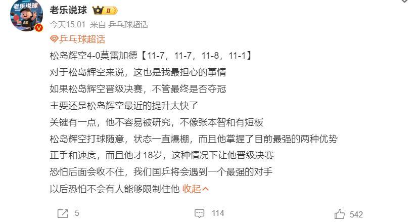 博主老樂說球這樣評價松島:他能4-0橫掃莫雷加德,這是我最擔心的事,如果他進入決賽無論奪冠與否都會成爲國乒未來一個最強對手。他的提升太快了,他不容易被研究打球隨心所欲,他現在掌控最強兩種優勢速度與正手,以後恐怕沒人能遏制住他了。
