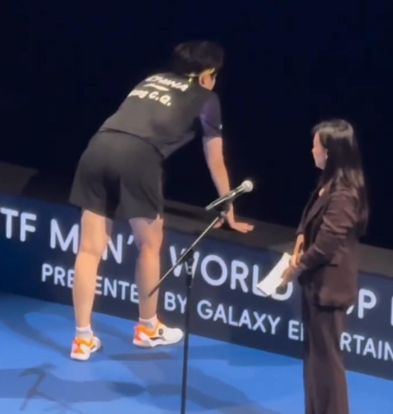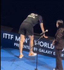 賽後王楚欽接受採訪時一度中斷,因爲王楚欽太過於疲勞,贏球后那股勁兒卸掉后王楚欽有些站不住,他雙手撐着展板過了一會兒才重新站起來接受採訪,王楚欽進入四強繼續扛着男乒。