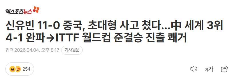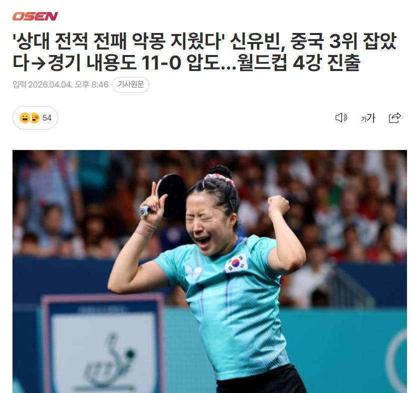 另一韓媒《世博新聞》則寫道:申裕斌單局11-0打崩世界第三的中國名將,她製造了巨大冷門,4-1挺進世界盃四強。