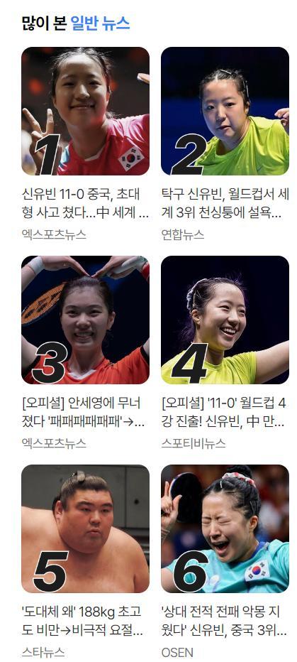 申裕斌這場比賽直接引爆了韓國媒體,在韓國媒體的熱搜榜前六申裕斌一人佔據了4席,這是屬於申裕斌的高光時刻。2025賽季去乒超錘鍊後她的即戰力的確在不斷的提升。