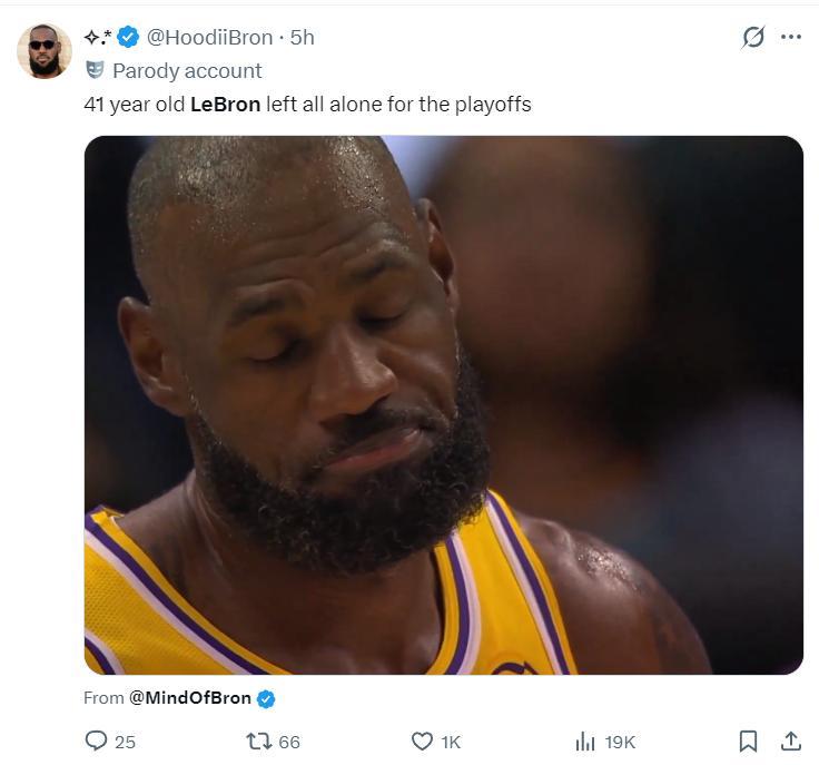 詹姆斯球迷:41歲的勒布朗要單核季後賽。(是詹姆斯搖頭閉眼的瞬間)